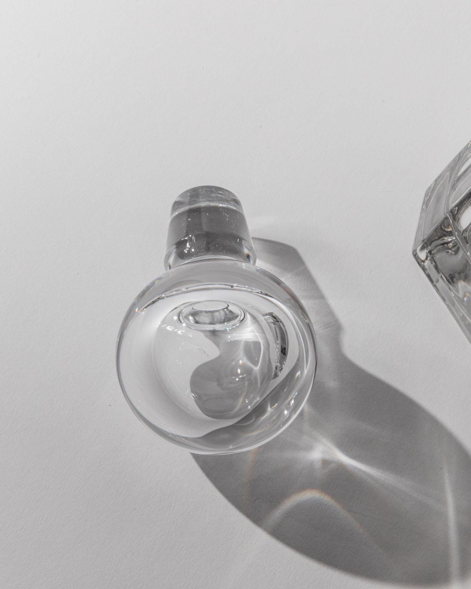 This vintage Murano glass decanter from the 1990s is a striking example of sculptural Italian design. Crafted from very heavy, high-quality clear glass, it features a perfectly balanced silhouette topped with a bold sphere stopper. The substantial weight and crystal clarity give it a refined, timeless presence, making it both a functional bar accessory and a decorative statement piece. An elegant and sophisticated gift idea for lovers of classic Murano craftsmanship and enduring design.