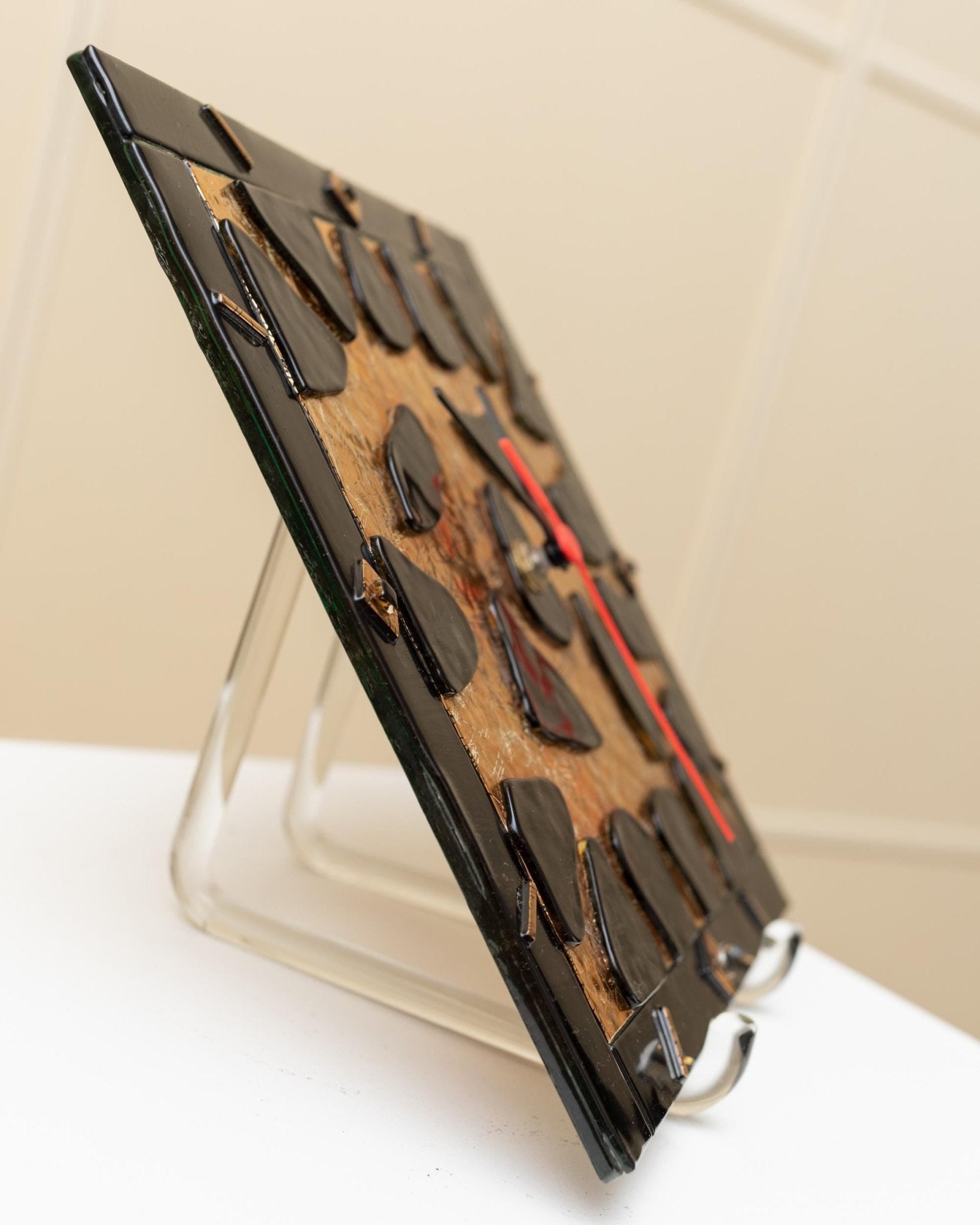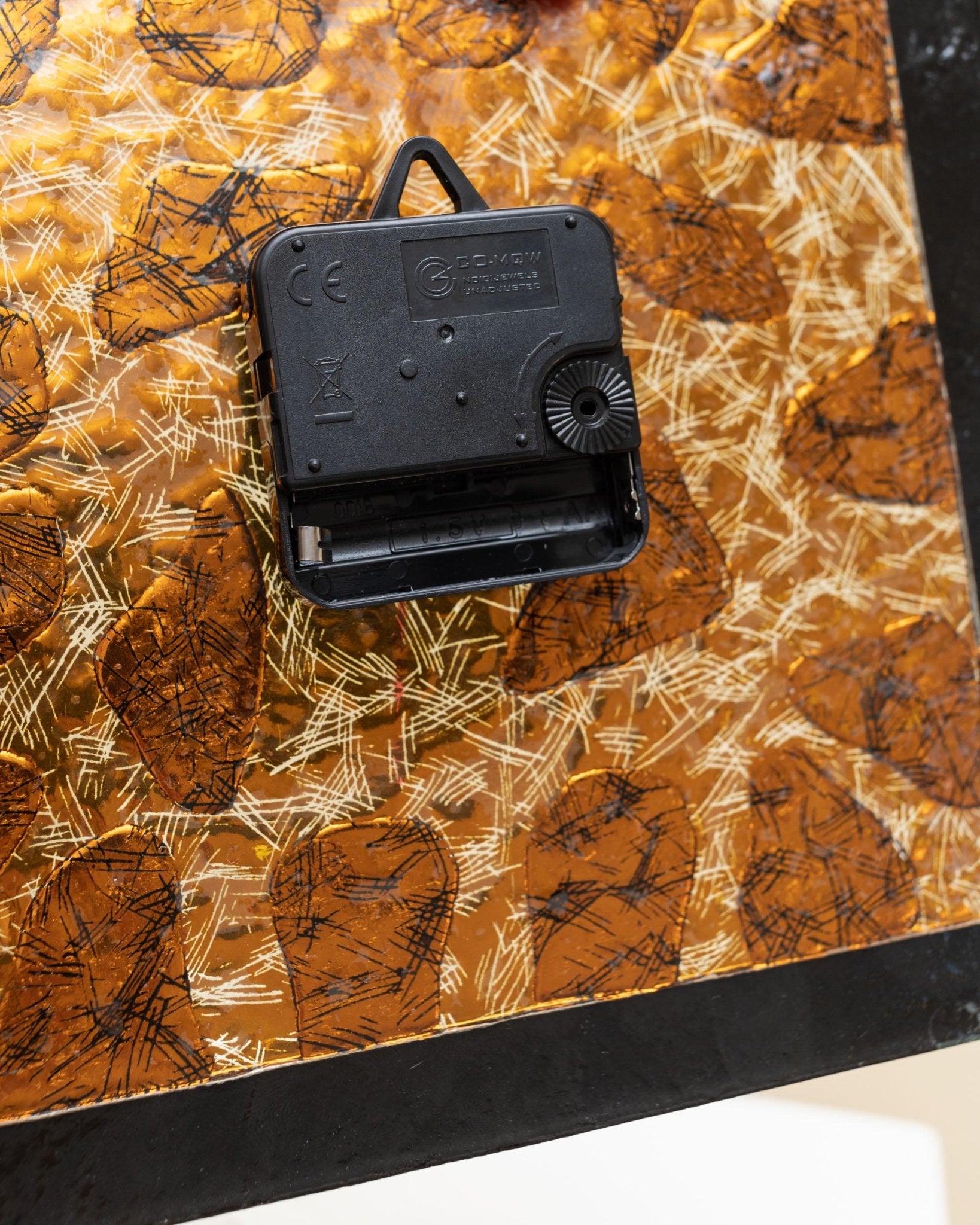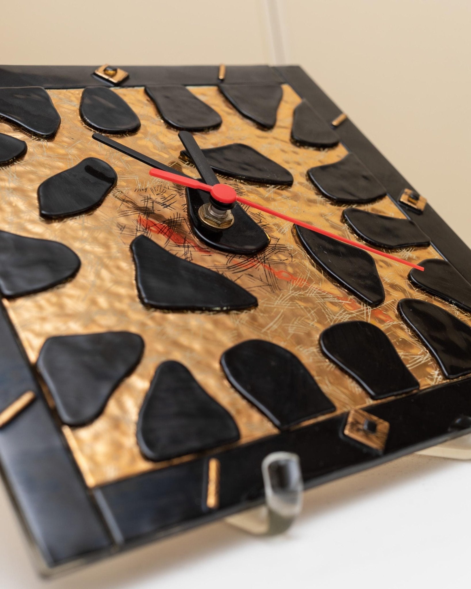 Questo esclusivo orologio da parete vintage colpisce per il suo design ad alto contrasto in stile Memphis. La forma quadrata con dettagli tattili in un motivo leo e la combinazione di colori oro e nero rappresentano il perfetto design postmoderno italiano degli anni '80. La finitura in vetro conferisce all'orologio una splendida lucentezza e lo rende semitrasparente in alcuni punti. L'orologio richiede una singola batteria AA.
