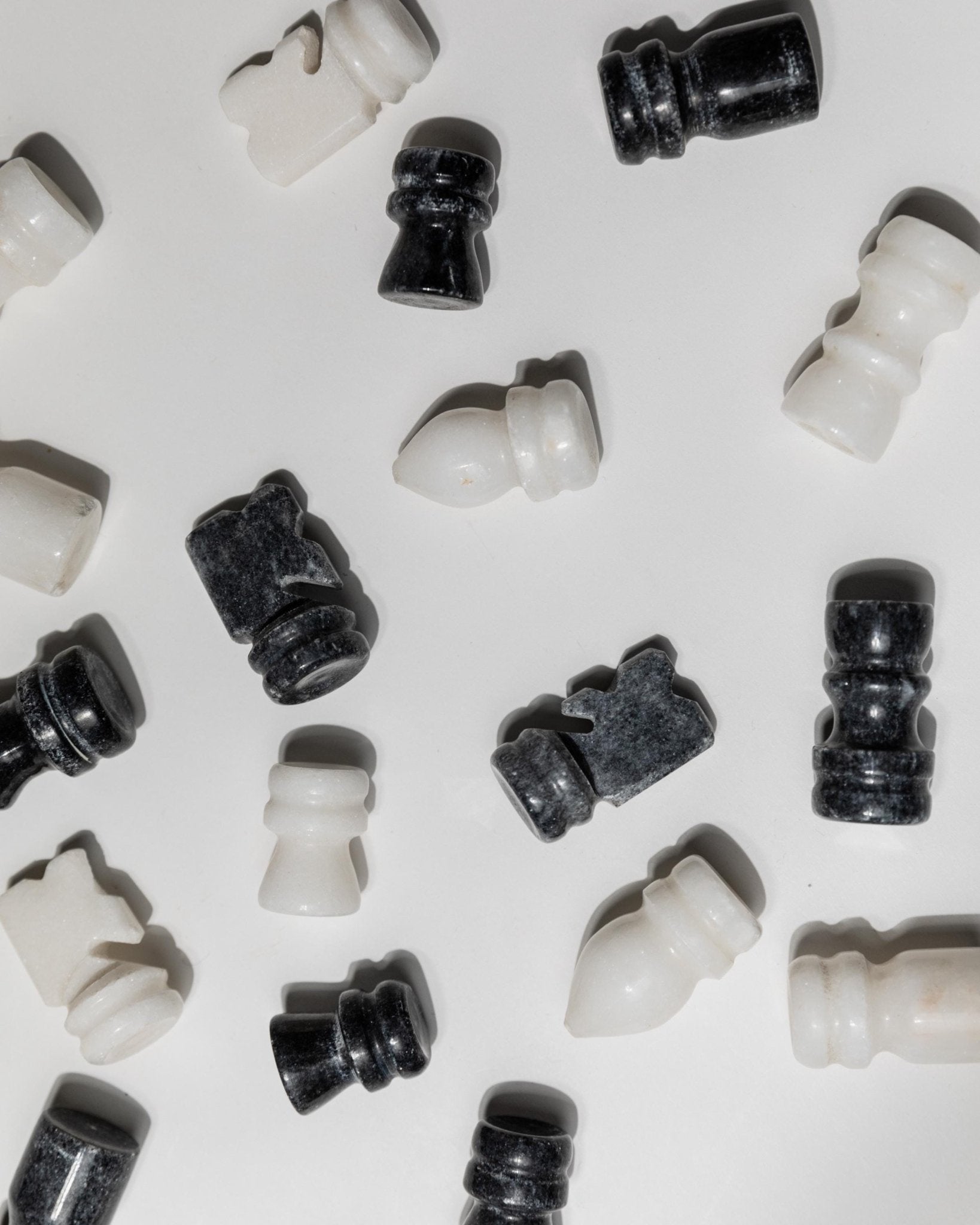 This vintage marble chessboard from the 1960s is a refined example of timeless Italian design. The board is crafted from black and white marble with a beautifully visible natural grain, paired with a full set of matching marble chess pieces. The base of the board is made from beige and brown marble, adding warmth and contrast to the set. With its substantial weight and sculptural presence, it serves as both a functional game and a decorative centerpiece. Perfect for display on a coffee table or for thoughtful matches, this set is a sophisticated gift for collectors and design lovers.