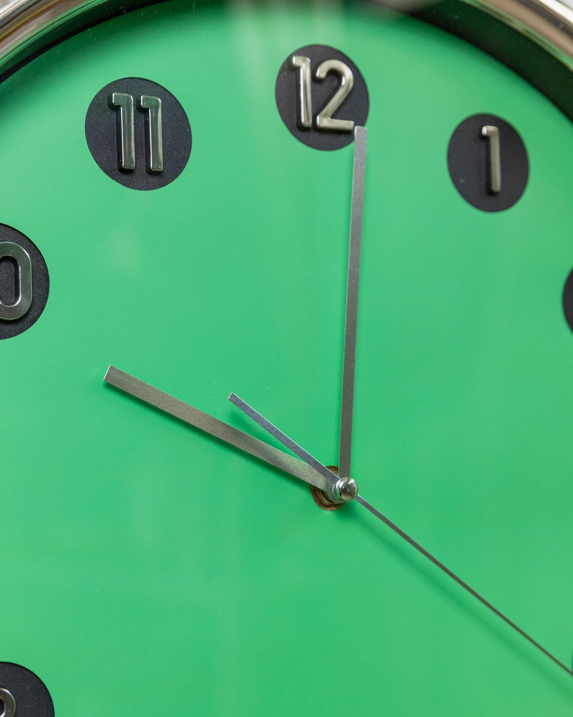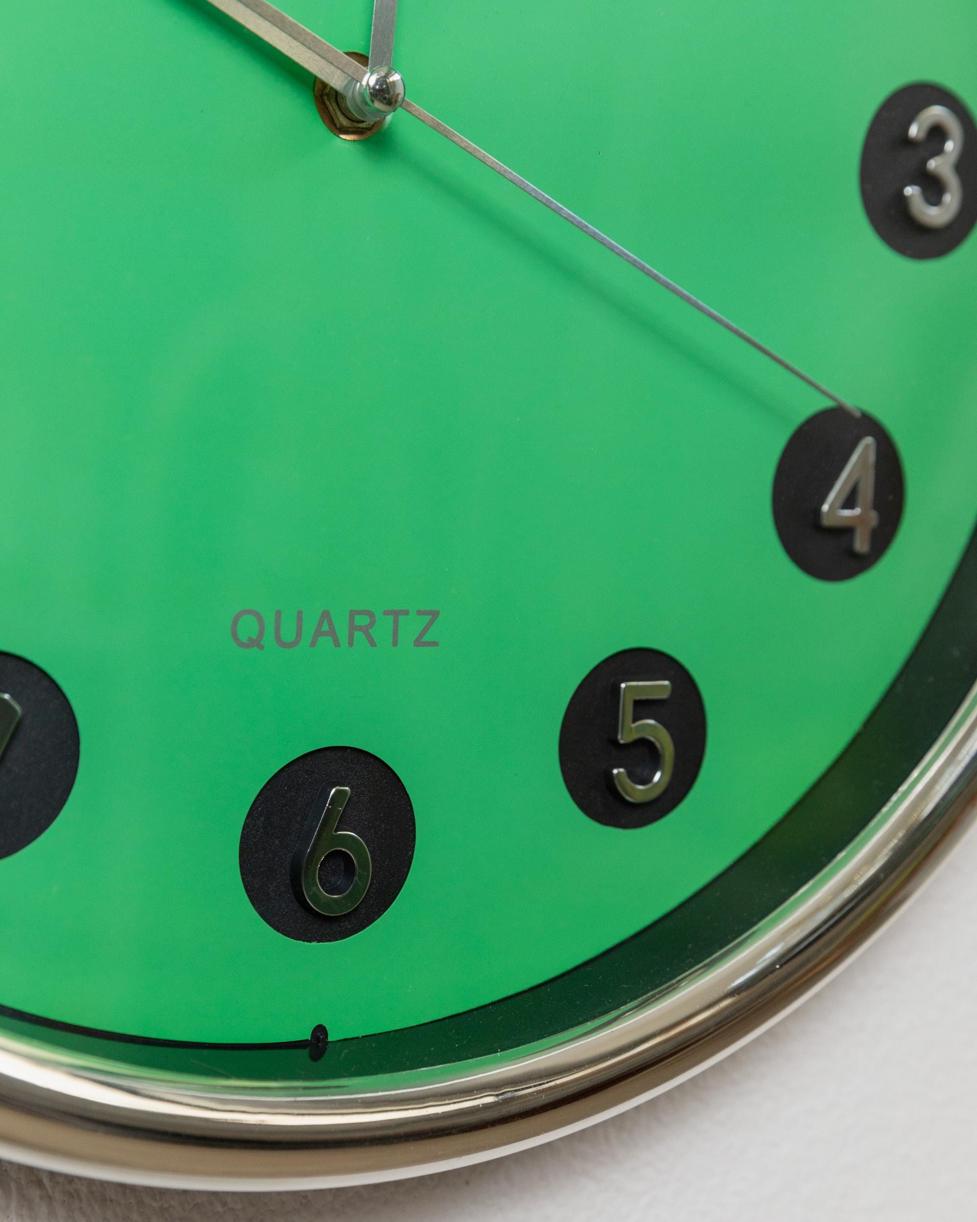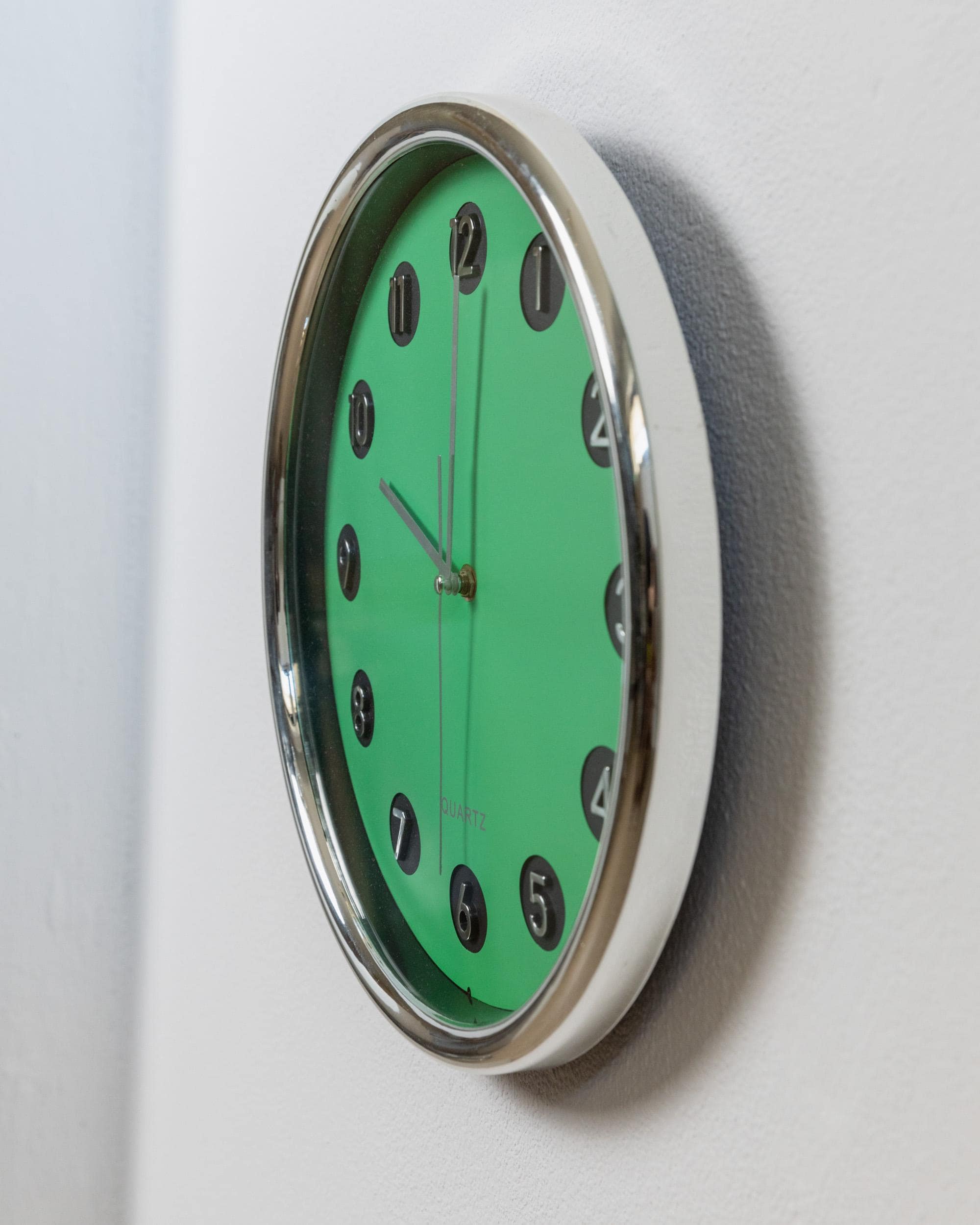 Questo orologio da parete vintage Space Age in verde presenta un design a papavero con dettagli cromati e numeri in rilievo, catturando l'essenza dello...