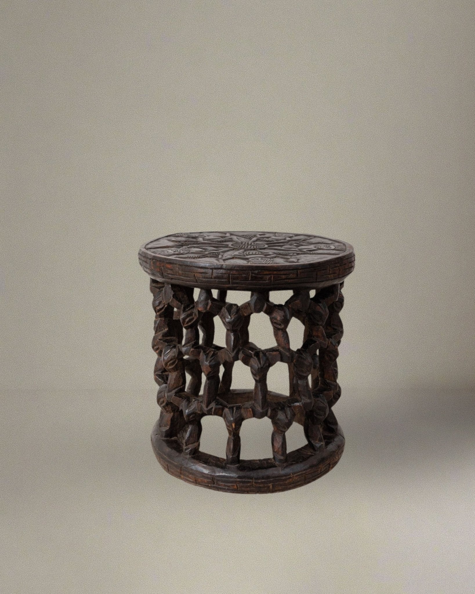 This copy is a handmade one -off and was carved from a single block. The spider motif is of particular importance in African Cameroon, because the floor spider living there lives underground and is faith so that the ancestors closer to the ancestors than we humans. Made in this stool or side table, the motif can be found as a pattern in the basic structure.
