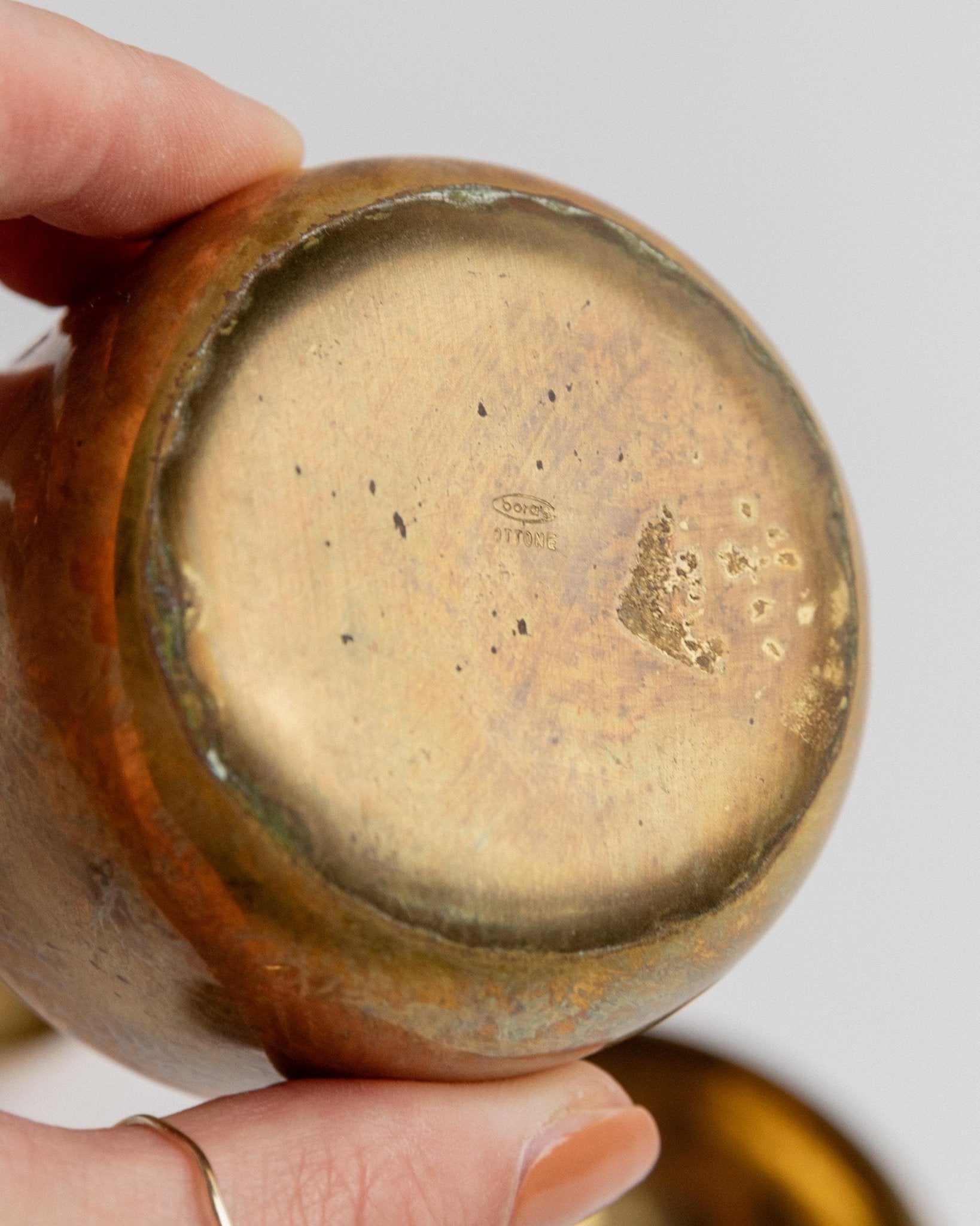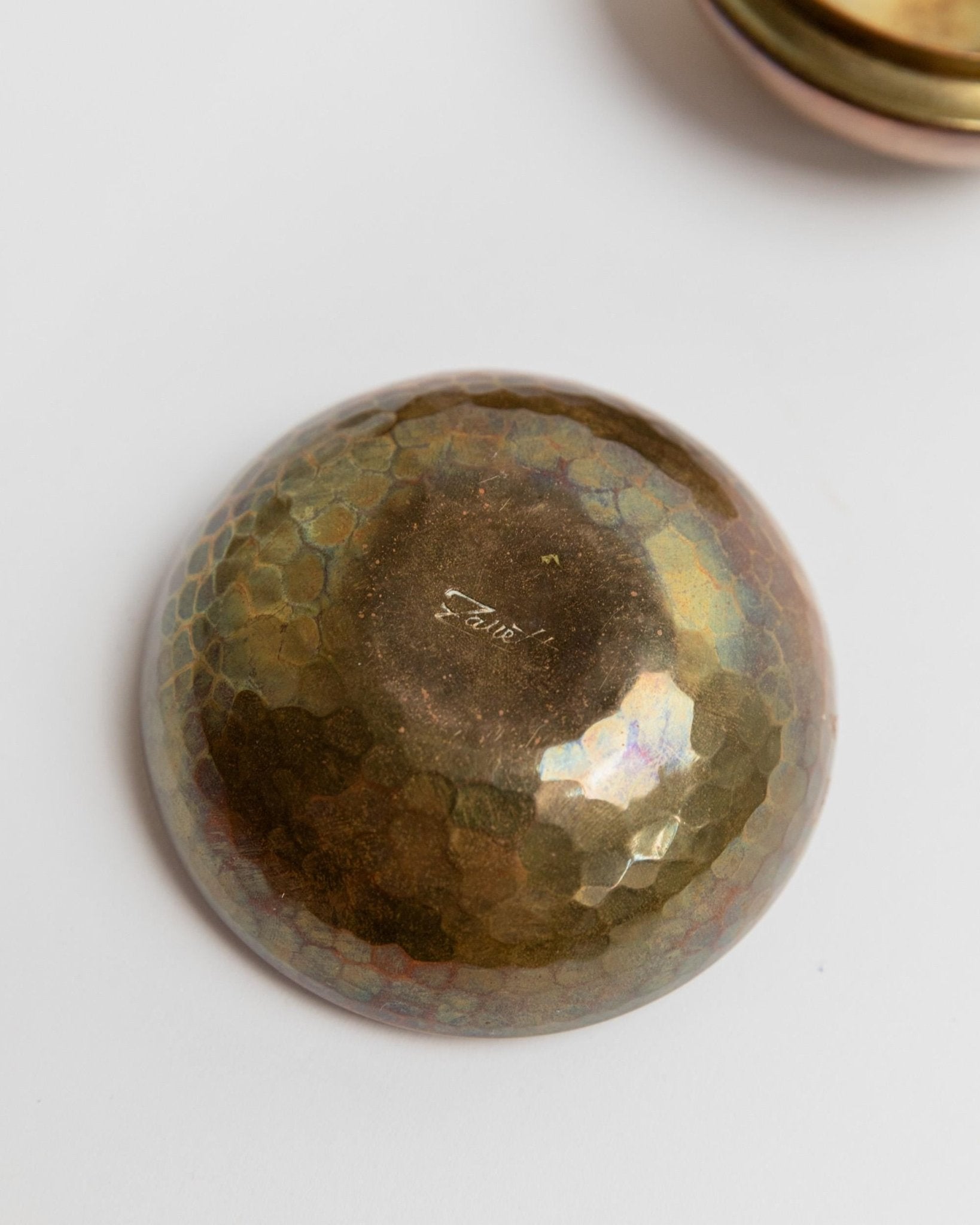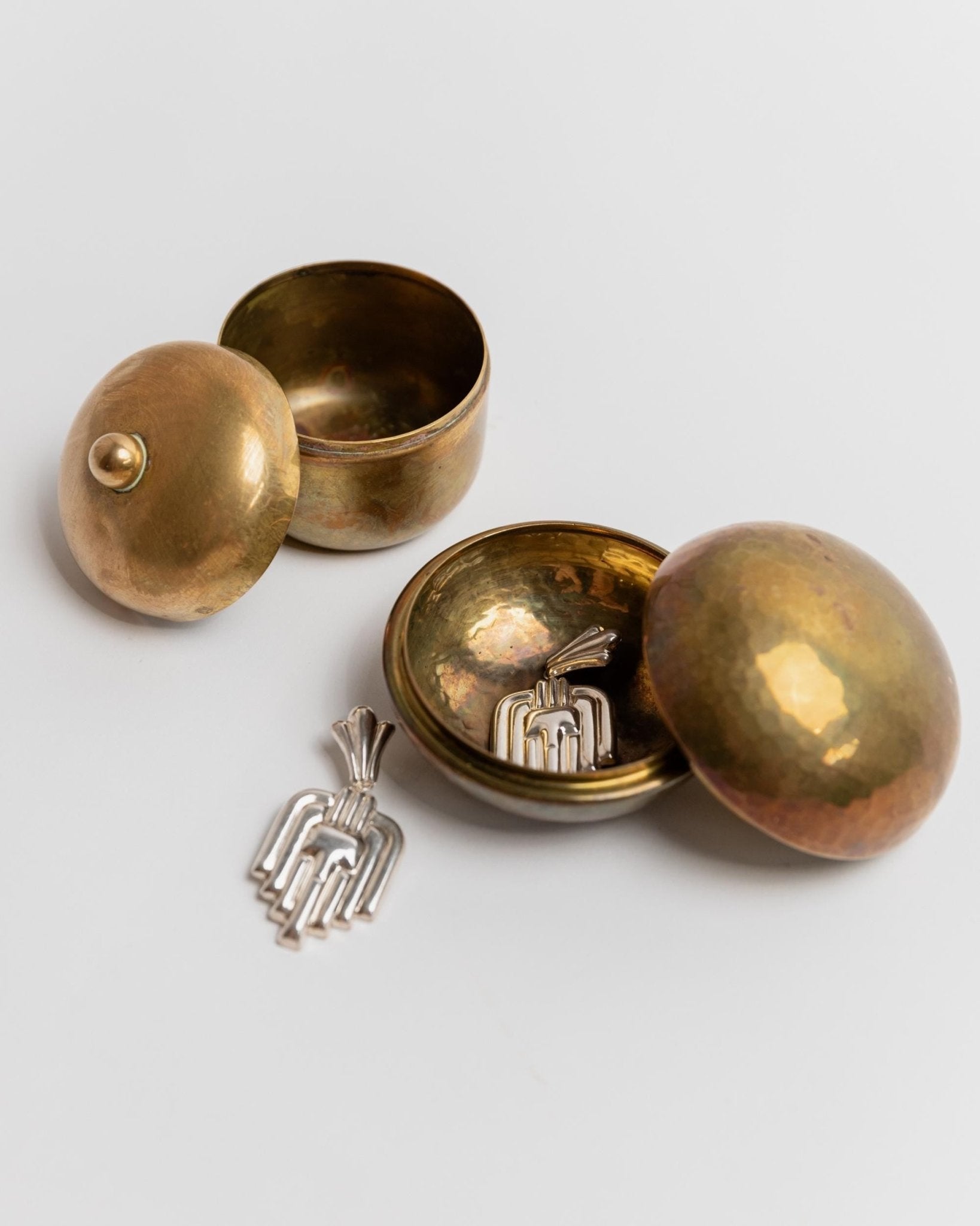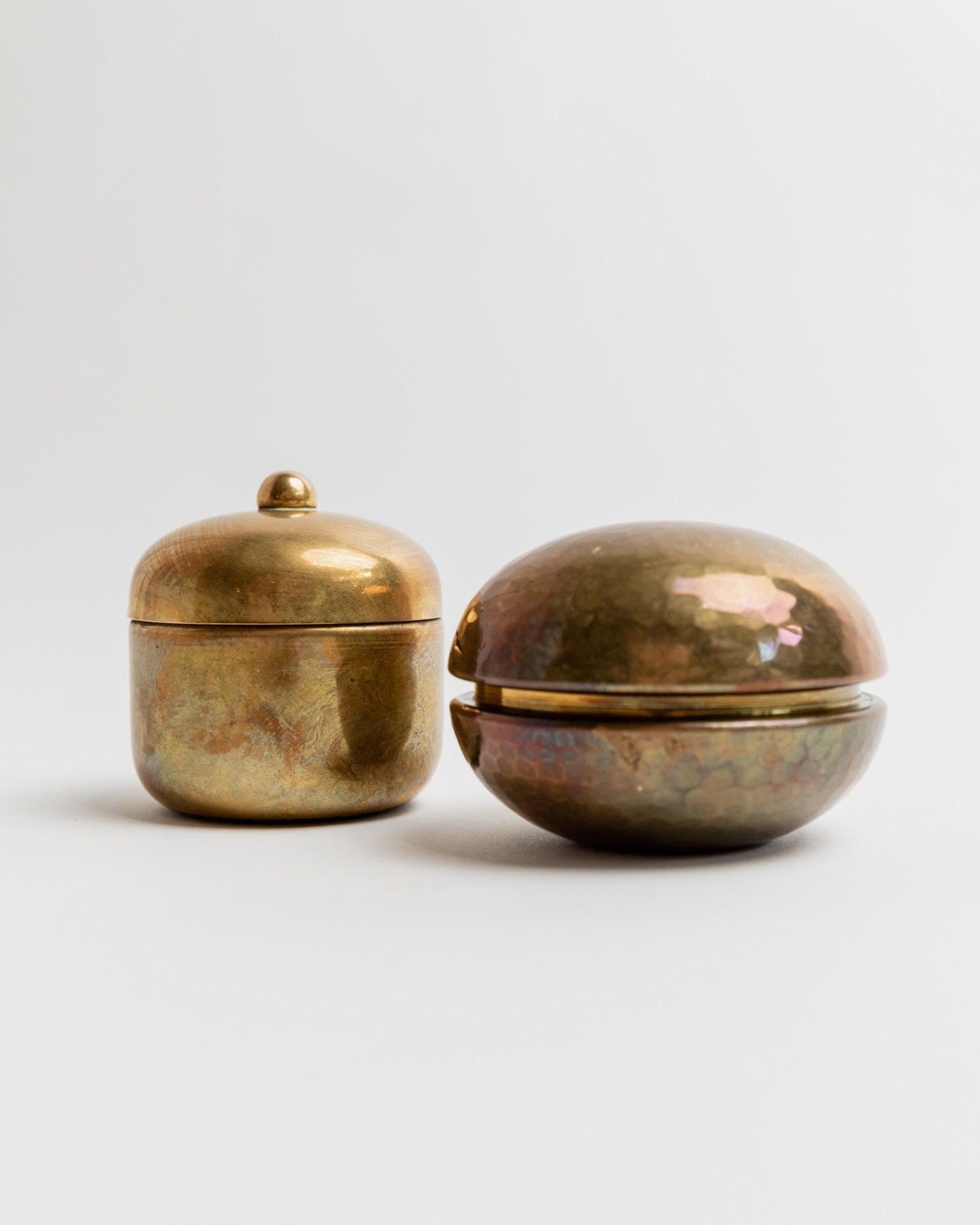 This charming set of two vintage brass tins from the 1950s combines handcrafted elegance with timeless utility. One features a round, softly hammered shape, the other an oval design with a delicate lid handle—together they make a beautifully balanced duo. Whether used as stylish storage for jewelry, pills, or small keepsakes, or simply as decorative accents, their warm brass tones and unique forms add character to your shelf or sideboard.