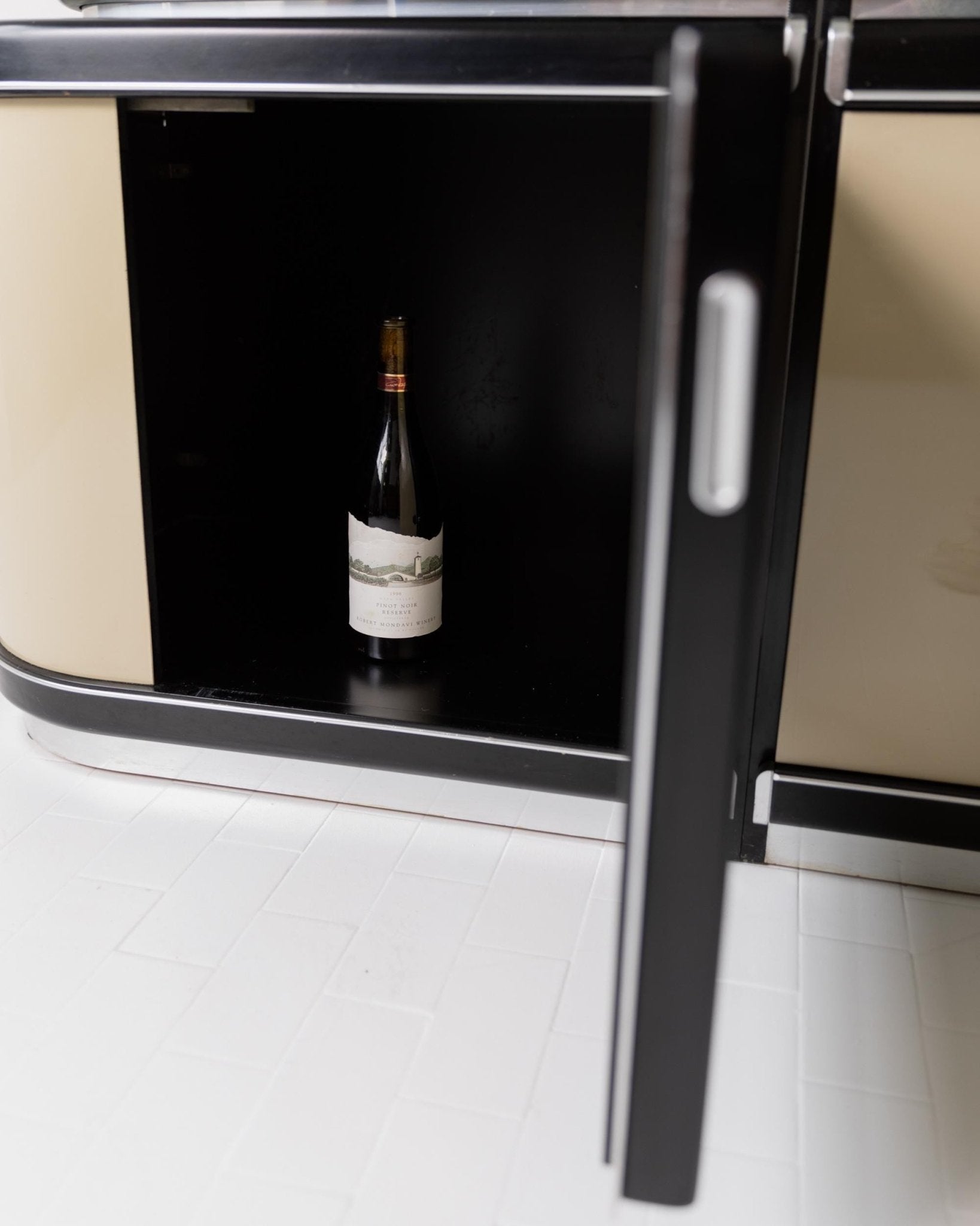 This exceptional vintage Art Deco design bar cabinet from the 1950s is a true statement piece, handcrafted in Italy with outstanding attention to detail. Designed in elegant black and beige lacquered wood, it is enriched with refined materials such as very rare and worthy green marble (Cipollino Garfagnana), brushed Aluminium elements, and beautifully curved smoked glass doors that open on two sides.