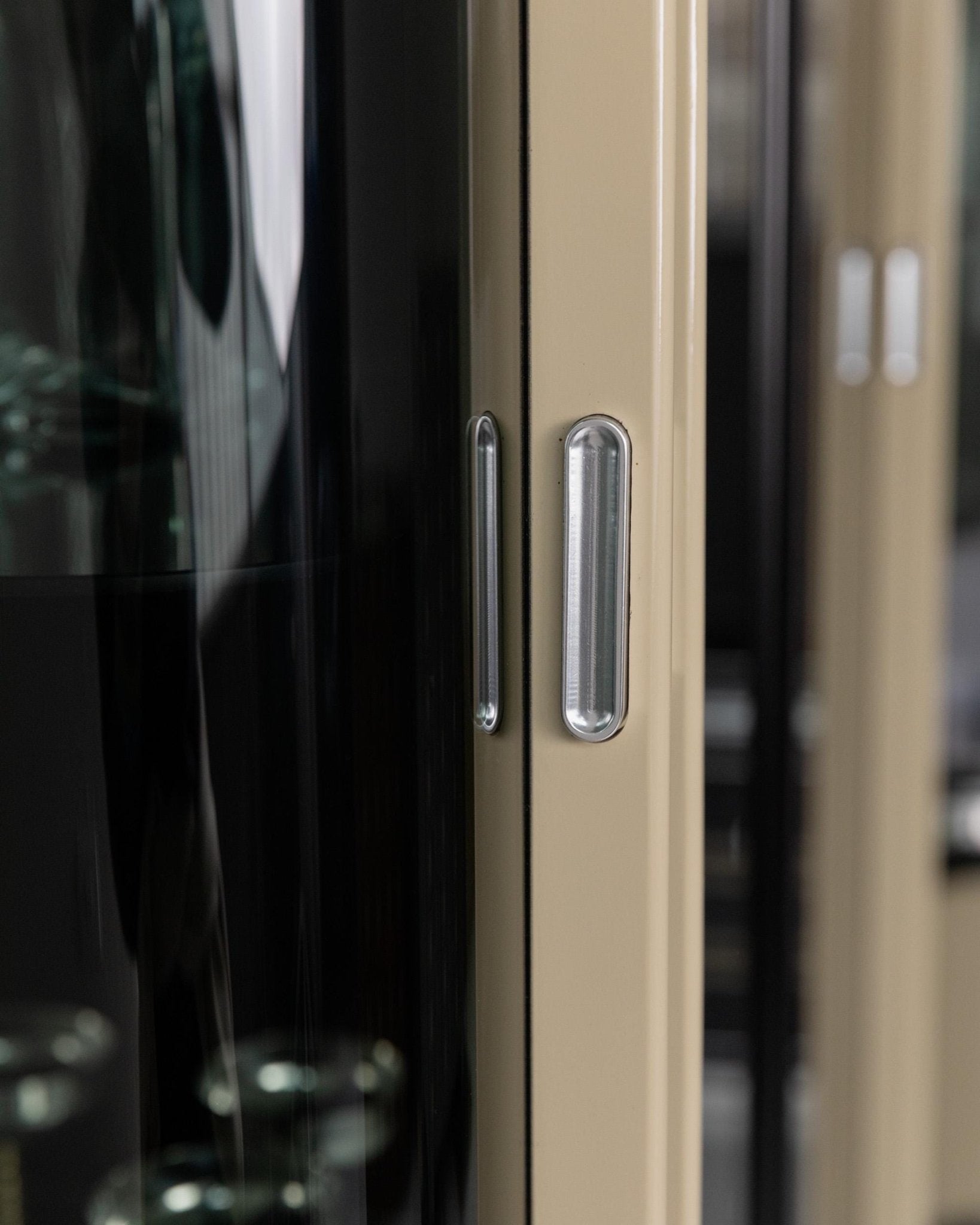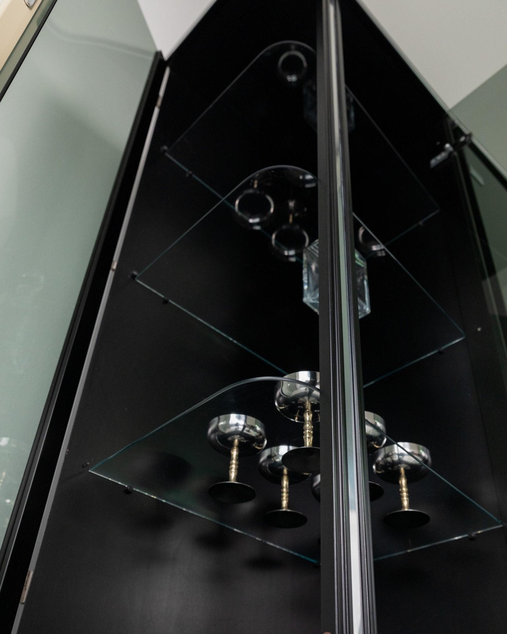 The cabinet is composed of modular elements and features six rounded glass shelves, offering generous space for glasses, bottles, and tableware. Fine Aluminium handles and trim at the top and base enhance its luxurious appearance, while the overall craftsmanship reflects the highest level of mid-century Italian design. Perfect as a bar cabinet, display vitrine, or sophisticated storage piece, it brings timeless elegance and architectural presence to your interior.