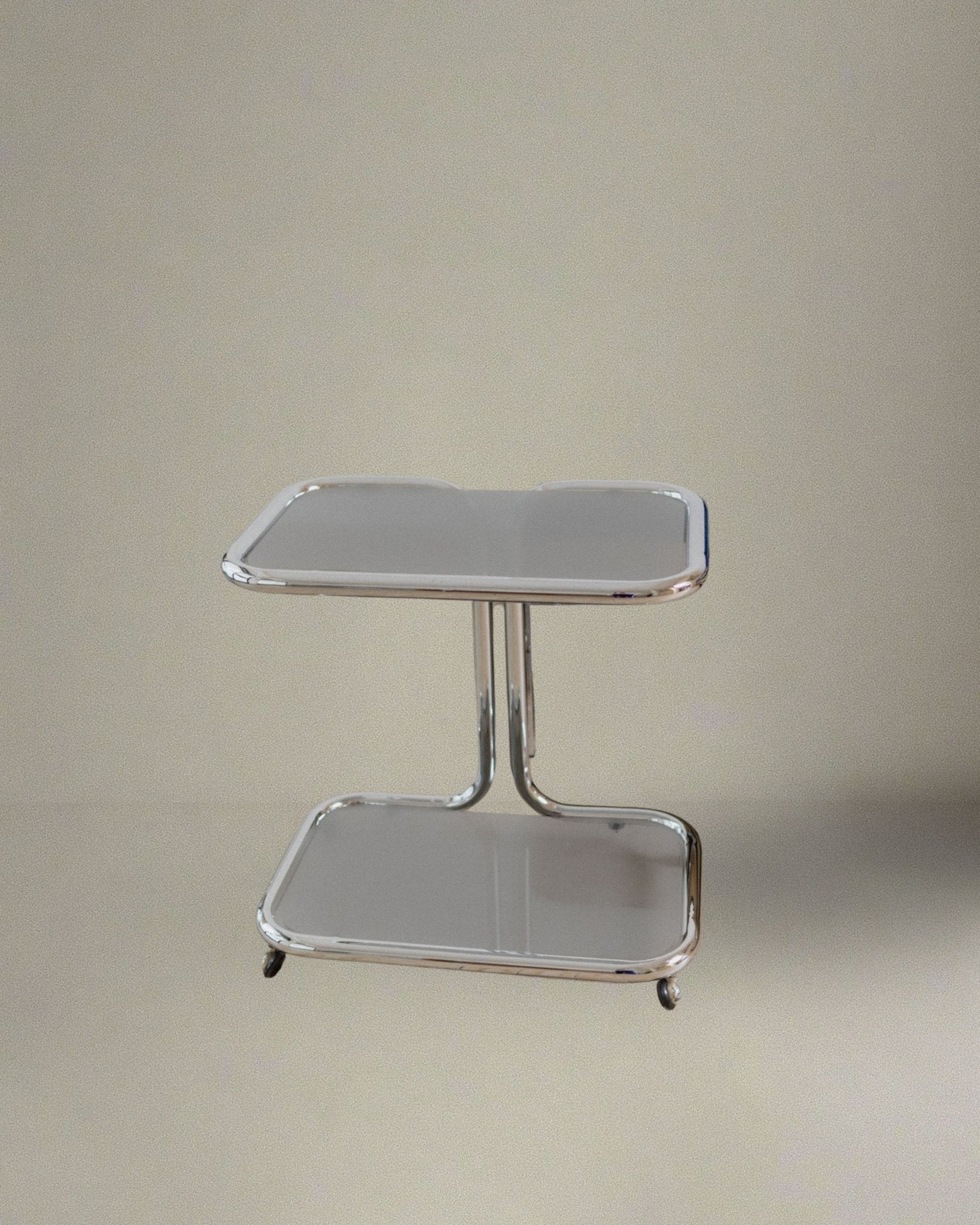 This elegant vintage side table combines functionality and style in a unique design. With two practical storage compartments, it not only offers space for books, magazines or decorative items, but also adds a stylish accent to your room. The combination of high-quality smoked glass and chrome gives the table a modern look that can be perfectly integrated into contemporary or retro-inspired living concepts. Ideal as a gift for lovers of retro style!