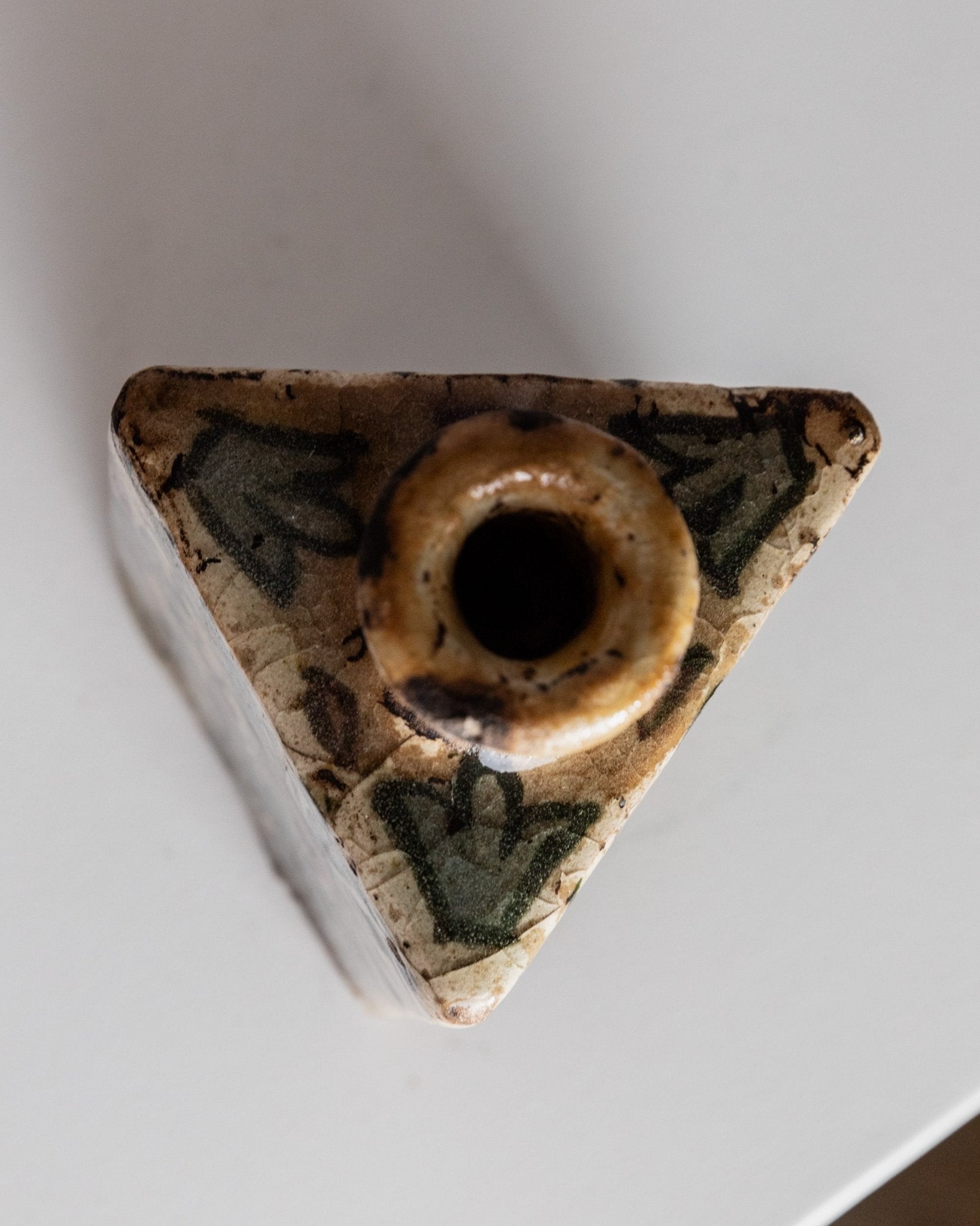 This rare antique terracotta bottle from 19th-century Iran is a remarkable artifact from the Qajar dynasty. Handcrafted and handpainted with intricate floral and bird motifs, it features an unusual triangular shape that enhances its sculptural and historic appeal. The delicate brushwork and warm earthy tones reflect the rich artistic tradition of the era, making it both a collector’s treasure and a museum-worthy decorative object. Perfect as a refined and meaningful gift, this piece embodies timeless beauty and cultural heritage.